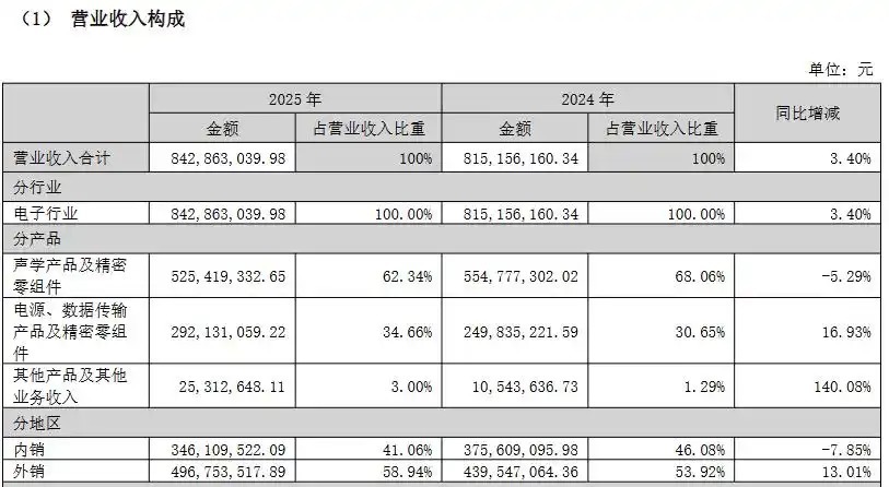 2025年,公司收入结构持续向核心主业收敛。声学产品及精密零组件实现收入5.26亿元,占总营收比重达62.34%,仍为第一大业务板块;电源、数据传输产品及精密零组件收入2.92亿元,占比34.66%,稳居第二。二者合计贡献97.00%的营业收入,主业聚焦度进一步提升。